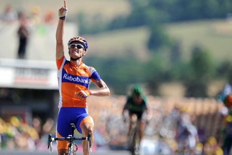 Plateau de Beille. Allá donde ganara Contador su primera etapa de esta carrera. Contador atacó sin miramientos una y otra vez hasta que dejó a todo el mundo sentado. Iba de blanco, el pinteño, y de amarillo el holandés. Subian a un ritmo de culebra, sólo resistían los mejores. Al final se quedaron los dos solos, mano a mano, y el líder lanzó un ataque a 300 metros que fue insuficiente, porque Contador cambió desarrollo y le barrió. Después Rassmusen se convirtió en un repudiado por su positivo y no volvimos a saber de él. Alberto Contador ganó el Tour ese año.